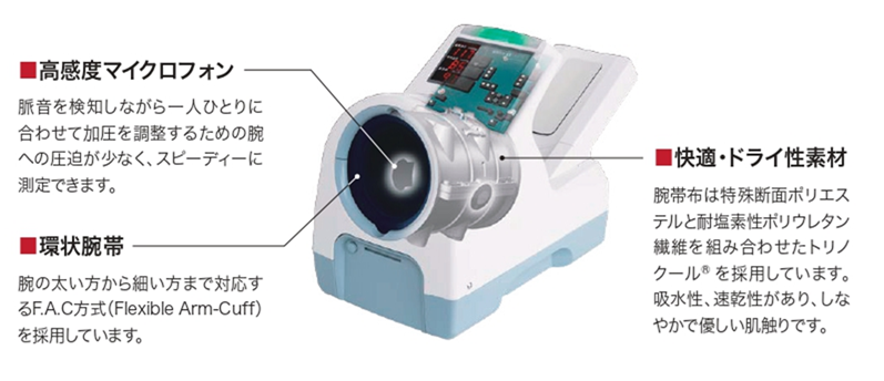 血圧測定法であるリバロッチ法*を基本にオシロメトリック法を組み合わせた測定方式を採用しています。